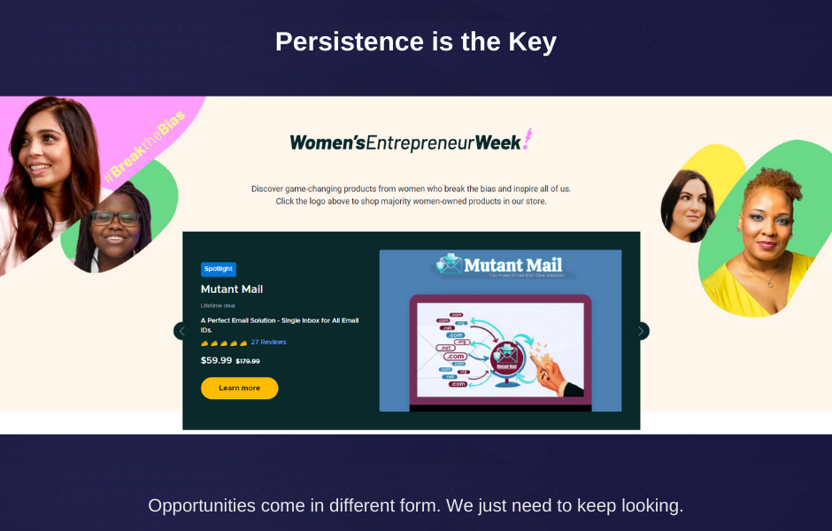 Mutant Mail made it to front page of AppSumo, and was added to Women Entrepreneur week on 24th March 2022. This gave the limelight to Mutant Mail, worthy of its innovative nature.